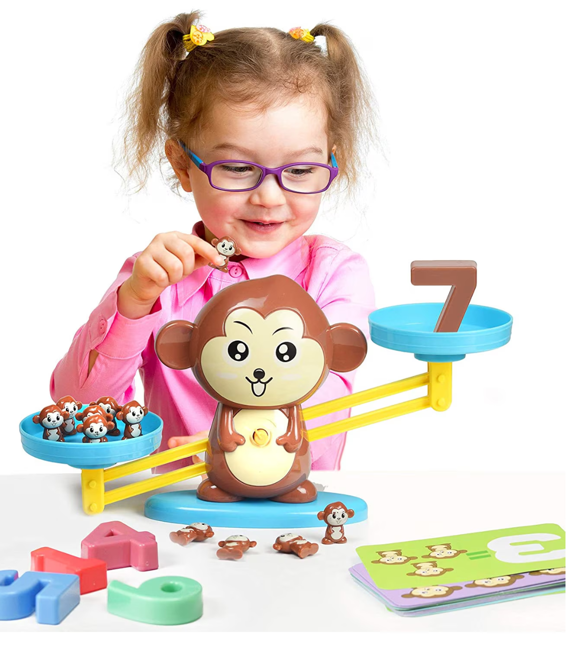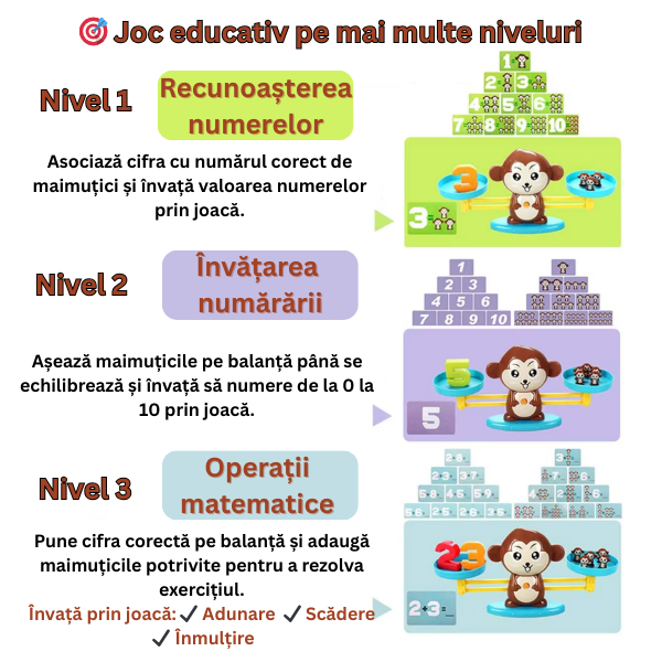 Prin așezarea pieselor pe balanță, copilul învață vizual și practic cum funcționează relația dintre numere.